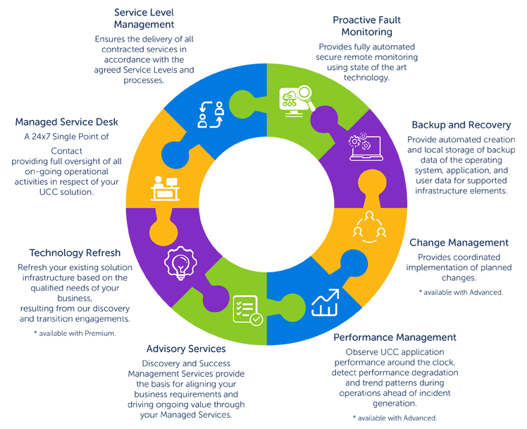 Our premium managed services are tailored to your individual needs. These offerings extend our Advanced services by incorporating a full technology refresh and delivering a complete as-a-service solution to meet your UCC business requirements. By following our proven transition-to-transform methodology and leveraging our Total Services Lifecycle model, we ensure a structured process and add expertise to deliver solutions that provide real value to your business.