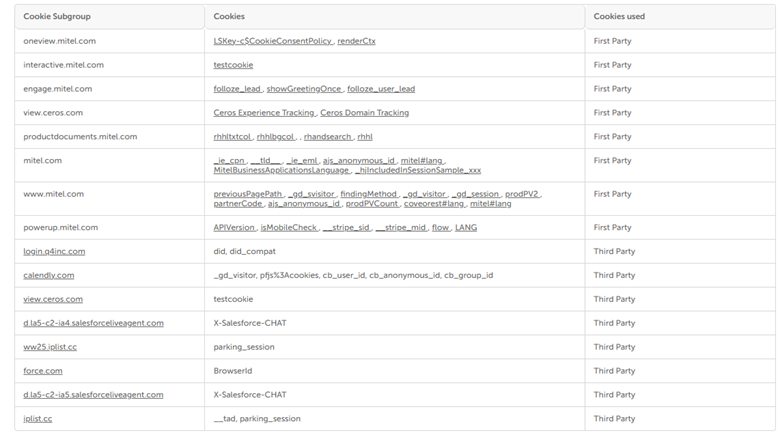 Mitel n'a pas directement accès aux informations collectées par les cookies tiers et ne peut accéder qu'aux informations que le développeur du cookie a mis à notre disposition.
