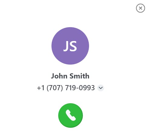 - En el cuadro de diálogo que se abre, haga clic en Llamar. Se abre una ventana que muestra el nombre el número predeterminado y el avatar del contacto.