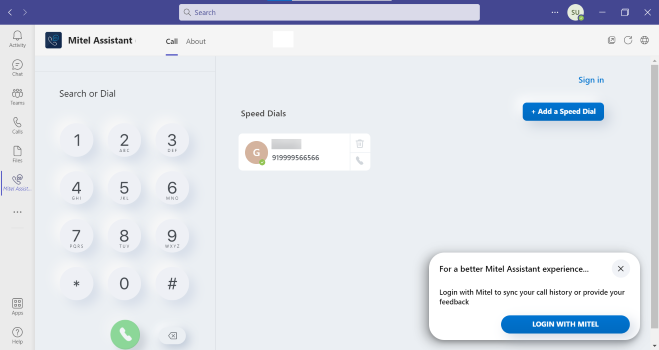 - Seleccione Mitel Assistant en el panel de navegación izquierdo de su aplicación Microsoft Teams. Se abre la página Llamar.