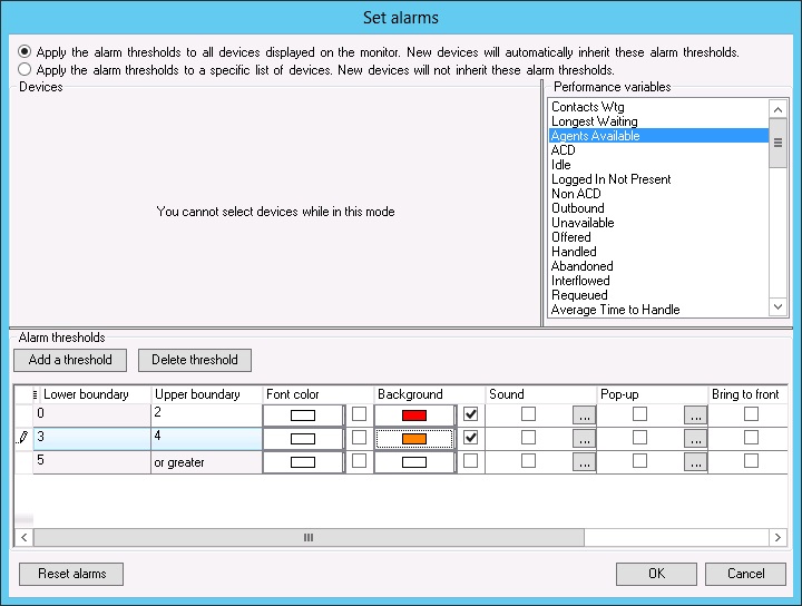 Consider the threshold programming in the following figure. When the number of agents available in the technical support queue is between 0 and 2, the cell housing the Agents Available statistic is red. When the number of agents available is between 3 and 4, the cell turns orange. When the number of agents available is 5 or greater, the cell turns white. In addition, audible alarms and pop-up alarms display.