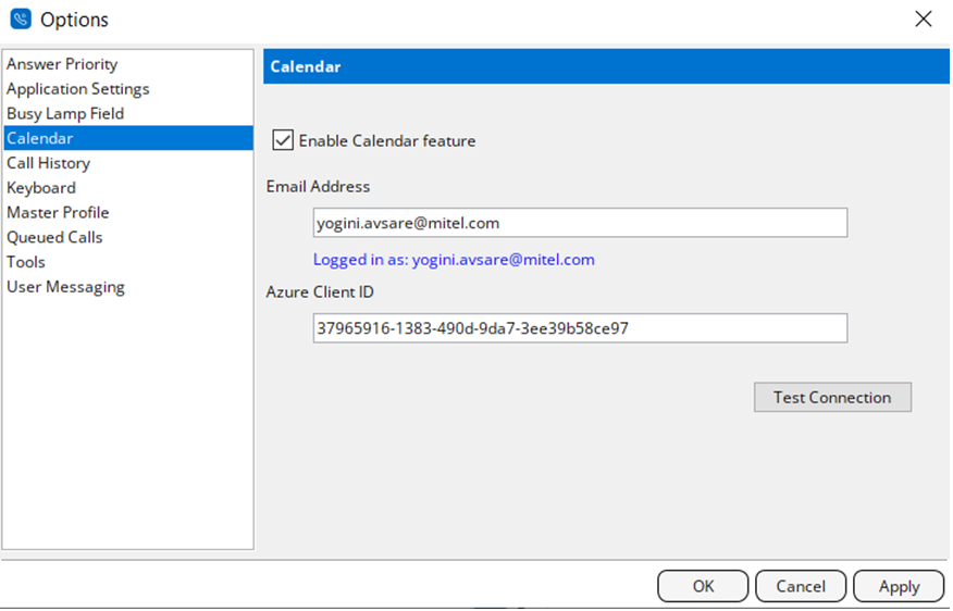 Press Test Connection to test the connection to Active Directory and to authenticate the Email Address user using the newly added Azure Client ID. The Azure Client application is created and configured the Azure Client ID in the Calendar Options panel of the MiVoice Business Console.