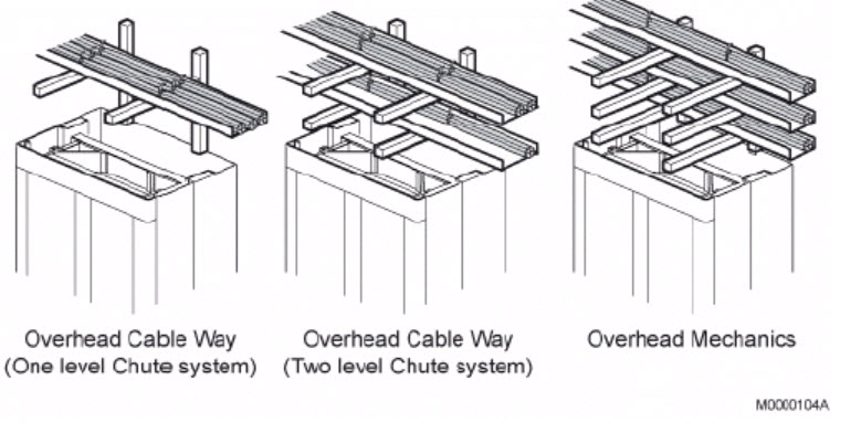 In an overhead cable chute system, all external cables are run above the cabinets. The cables can be run in an overhead cable way with chute systems in one level or more.