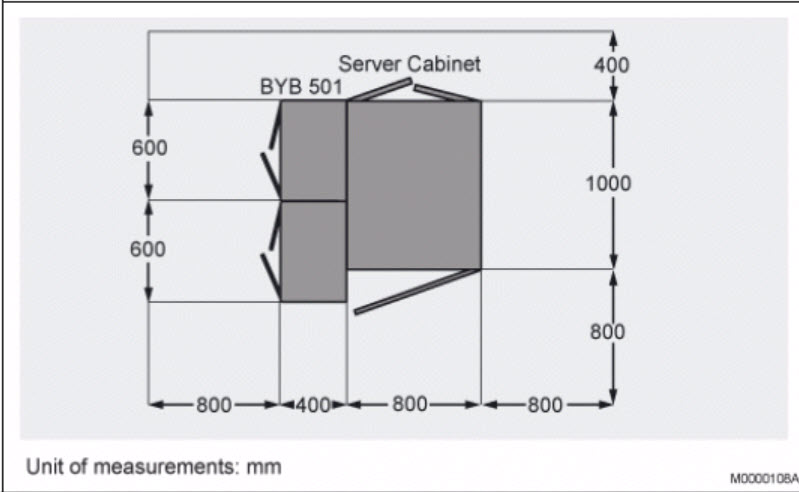 In this layout, the back of the BYB 501 cabinets are placed up against the side of the server cabinet.