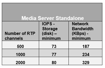 The values do not consider the RTP/SRTP media bandwidth on the IP network, which must be added to the IOPS and signaling bandwidth shown in the following table. The additional bandwidth needed range from 8K to 80K Kbps of bandwidth per RTP session, depending on the codecs used.