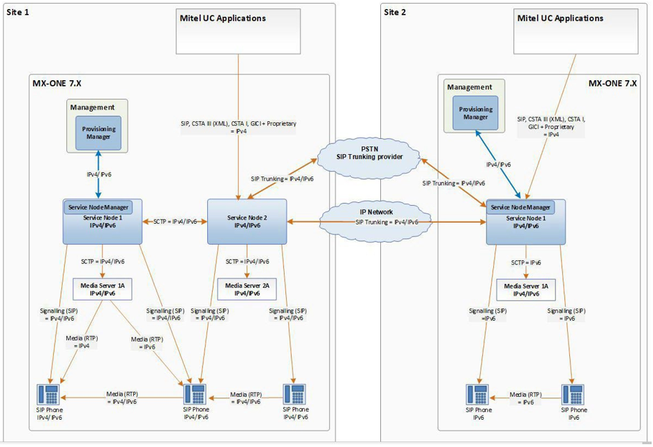 The figure below shows how the different MX-ONE components interwork with IPv4-IPv6.