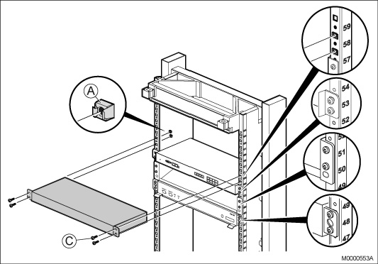 - Fasten the 1U chassis to the four captive nuts in the cabinet, using the four screws (C).