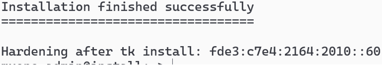 Follow on screen printouts of installation progress. For a more detailed view, follow the installation for a server with command tail -F /var/log/messages