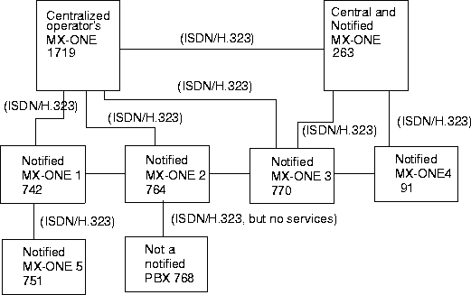 In the figure above, there are two exchanges which are central operator exchanges, and five sub-exchanges, plus one exchange (768) which is not part of the ISDN or H.323 network regarding services. The numbers 742, 63 etc. indicate the own exchange numbers. Any of the exchanges may have incoming public external lines.
