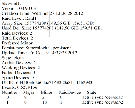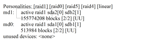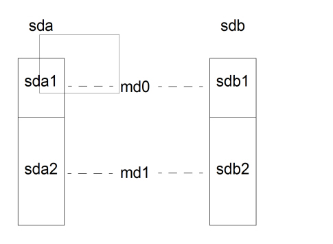 The RAID partition md0 is made up by sda1 and sdb1. The RAID partition md1 is made up by sda2 and sdb2.