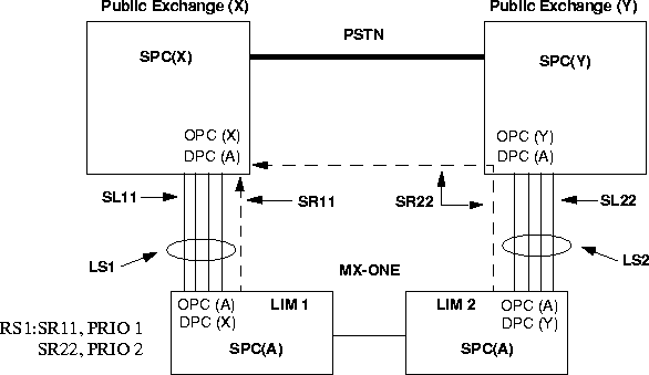 In the figure above the route set RS1 is set up between Signaling Point Code (SPC) (A) and SPC(X). Signaling routes SR11 and SR22 belongs to RS1. A route set RS2 has to exist between SPC(A) and SPC(Y) but that is not shown in the figure.
