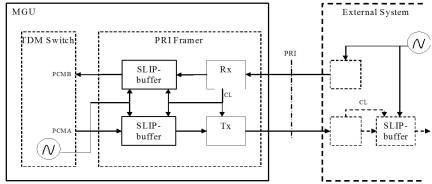 Each PRI interface contains “elastic” buffers (also known as Slip buffers) in order to handle situations with different clock frequencies between MGU2 and an external telephony system. Slip buffers are always active in the receive path, but in the transmit path (towards the external system) it is optional to use.