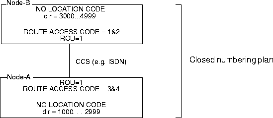 The two exchanges use a closed numbering plan (that is, no conflicting directory numbers). The first digit of the cooperating exchange directory number series is used as route access code.