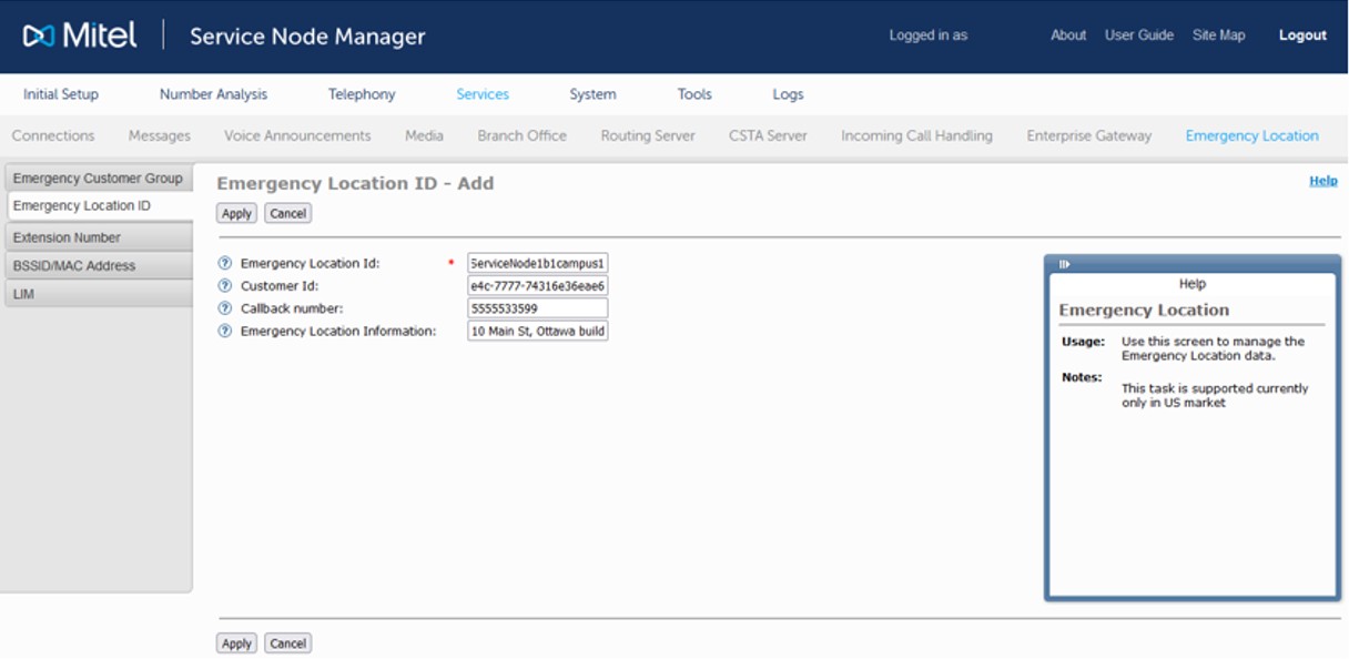 - In SNM, go to the Services> Emergency Location menu. Add the required information for the Emergency Location Id task and click Apply.Figure 1. Emergency Location ID