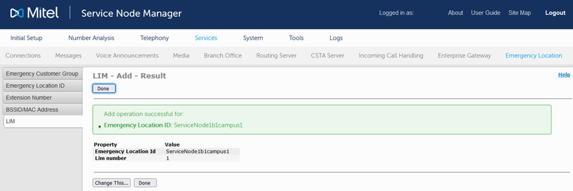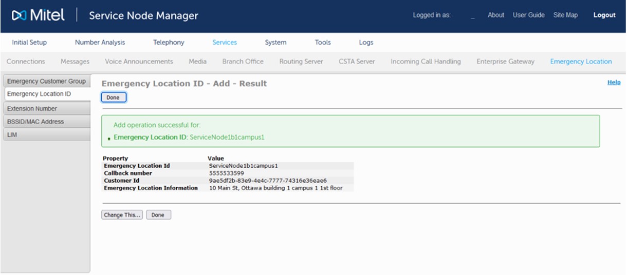 Figure 2. Emergency Location ID - Add - ResultThis Location ID now can be associated to a Service Node.