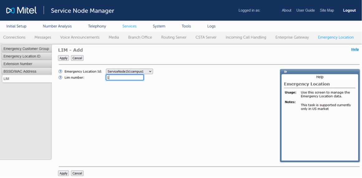 - From the drop-down list, select the previously created Emergency Location Id to be associated with a Service Node number (for example, Service Node 1 (LIM 1)), and click Apply.Figure 4. LIM - Add -ResultThe LIM number is successfully added.