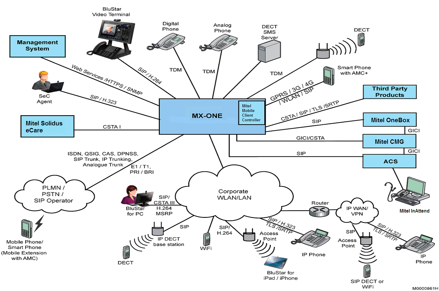 Figure 1. MX-ONE Telephony Scenario with H.323 extensions (and other end points)