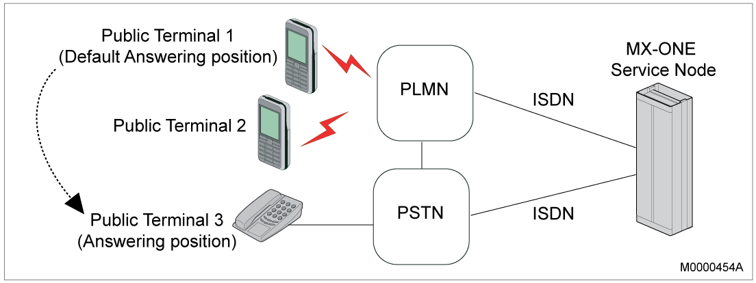 If there are a number of terminals associated with one MX-ONE Service Node remote extension directory number, the answering position can be changed through a procedure or CSTA request; that is, calls can be addressed to a terminal; that is different from the one stated as default public remote extension. In this way, the remote extension with multiple terminals associated with the same directory number can decide at any moment to set as answering position the terminal the user is placed where the user is situated. Selected, active, answering position is stored in semi-permanent data.