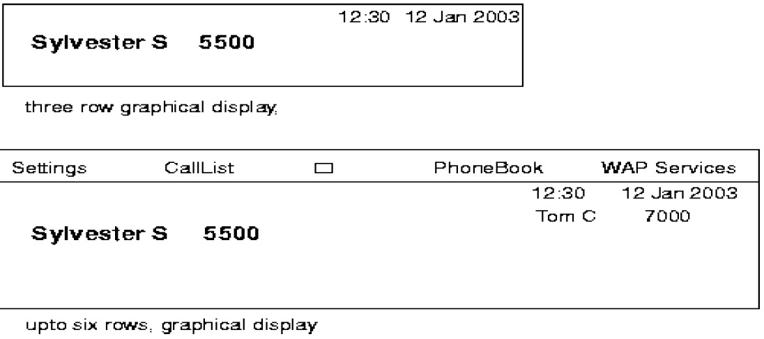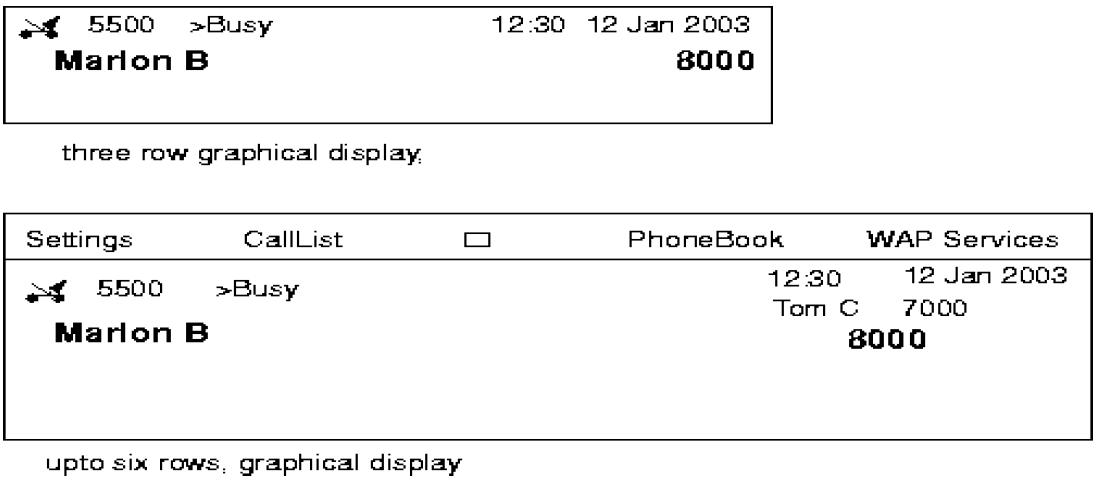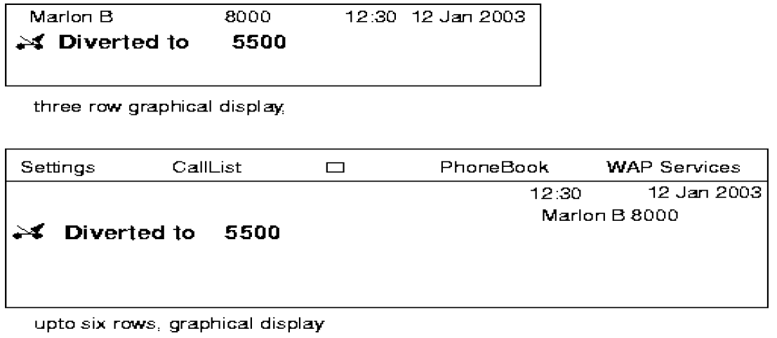 Incoming call from a diverted on busy party. MARLON BRANDO with directory number 8000 calls to STALLONE with directory number 5500. STALLONE has a diversion on busy programmed to TOM CRUISE. The display of TOM CRUISE will look as follow: