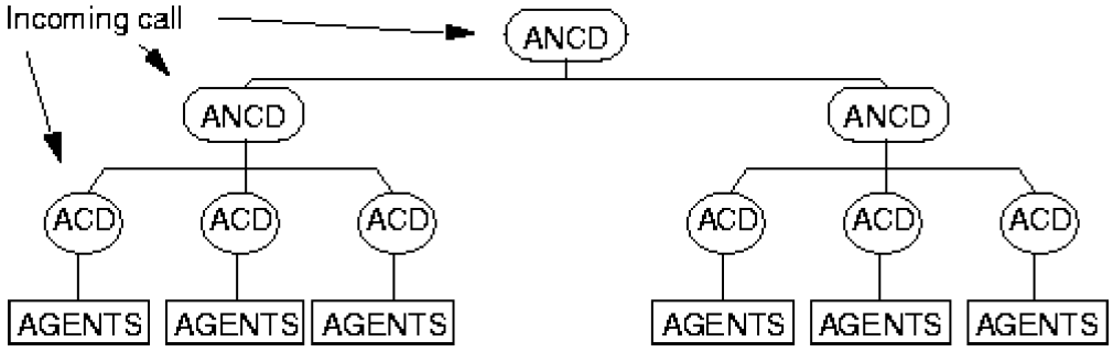 The ANCD group differs from the ACD group in that its members are only other ANCD or ACD groups and not ACD agents. This means that it is possible to configure a distribution tree of ANCD and ACD groups that are used to either distribute or redistribute calls to the ACD group that can best handle the call. The ANCD group will always know the current status of the ANCD and ACD groups that are configured as its members. Different ACD groups can be member of a common ANCD group, which at the same time, can be a member of another ANCD group.