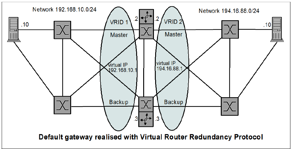 Above is a picture with a network that implements one virtual router on the outgoing side (VRID 1) and another virtual router on the incoming side (VRID2). With this setup it is possible to have resilient routing both into and out of the domain without having to run a dynamic routing protocol.