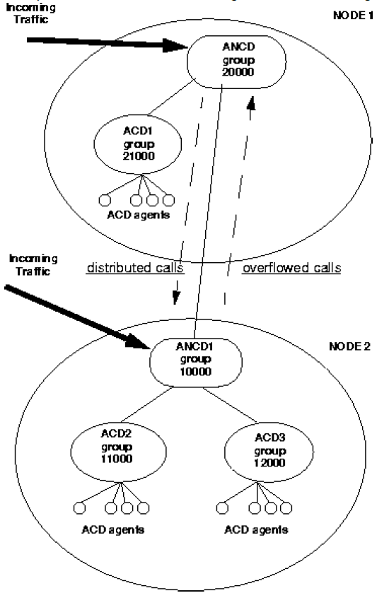 The superior ANCD group is initiated in NODE1 with two satellite groups as members. One satellite ACD group is initiated in NODE1 and a second satellite ANCD group is initiated in NODE 2. Calls to the superior ANCD group will be distributed to the best available satellite group and calls to the satellite groups (in case if the agents are not available) will be overflowed to the superior ANCD group. This example only gives the initiation of ANCD group, for ACD groups see operational directions for AUTOMATIC CALL DISTRIBUTION, AC.