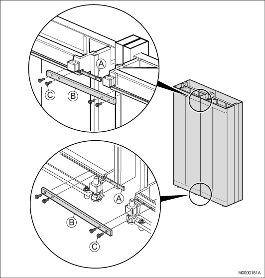 1. Install the earthing bars (B) with screws (C) and, a washer between the earth bar and the cabinet, see Figure :Mounting the Earth Bar on page 10. (Bar nut (A) is not used in some cabinet) .