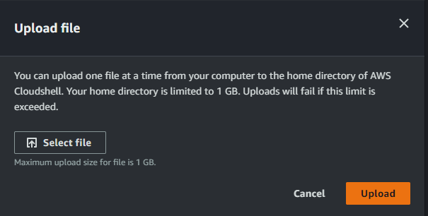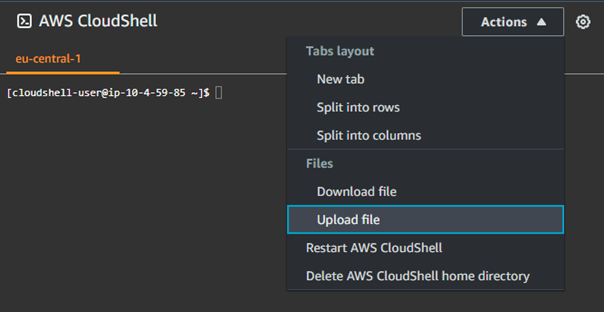 Note: CloudShell is available only in selected regions. Choose the region closest to your deployment region. From the Actions drop-down menu, select Upload file.