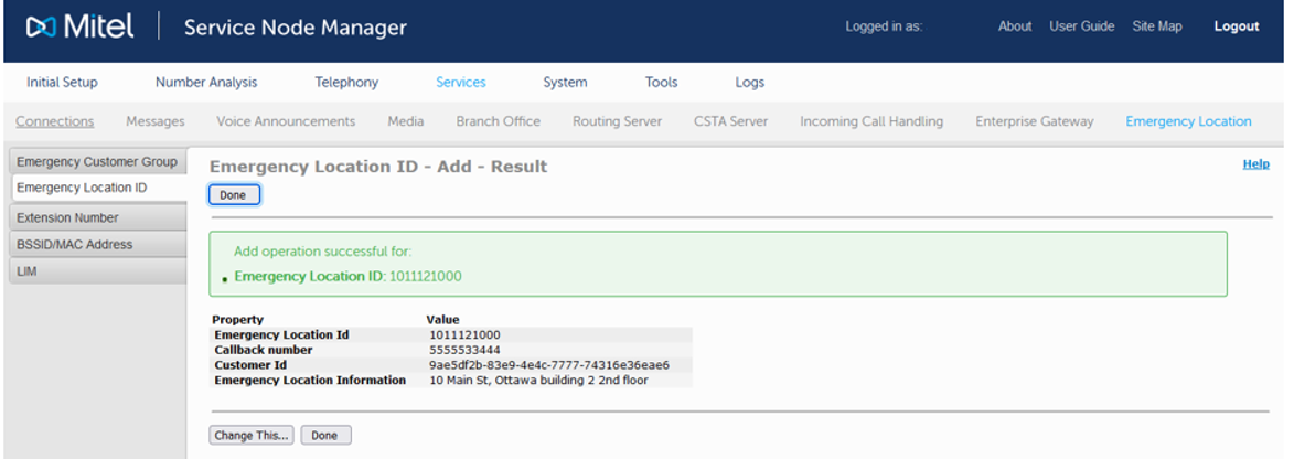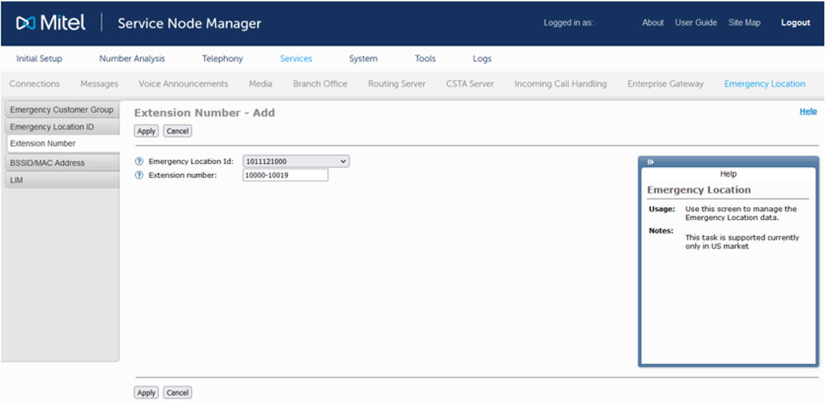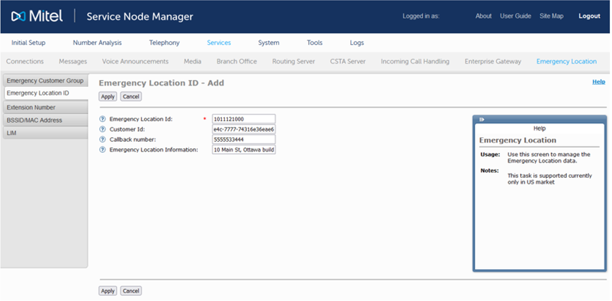 - In SNM, go to Services> Emergency Location menu. Add the required information for the Emergency Location Id task and click Apply.Figure 1. Emergency Location IDFigure 2. Emergency Location ID - Add - Result