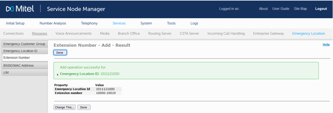 - From the drop-down list, select the previously created Emergency Location Id and enter a range of extension numbers (for example, extensions 10000 up to 10019) and click Apply to associate the Location ID with this range of extension numbers.Figure 4. Extension Number - Add -ResultThe Extension Number is successfully added.