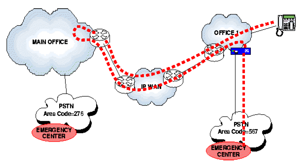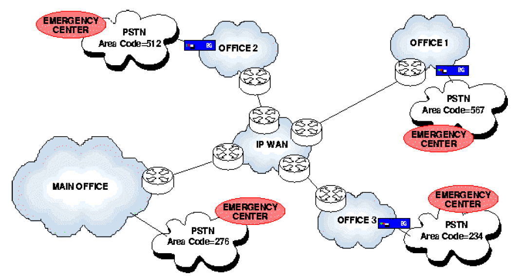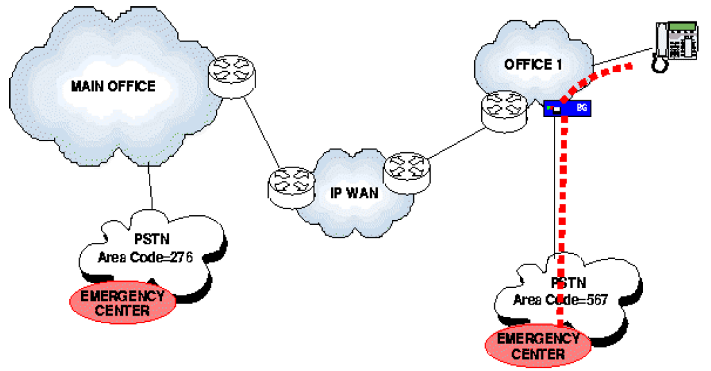In complex network configurations with remote branch offices in different geographical areas, when the emergency call is set up through the public trunk located in the main office, the remote branch offices must provide A-numbers associated to their remote geographical area, see Figure 1.