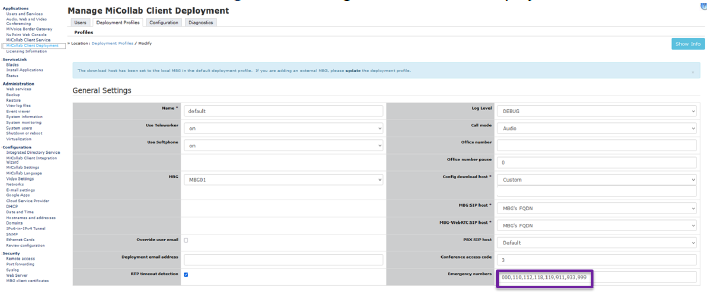 Via the MiCollab Server, configure the Emergency Dial Plan under MiCollab Client Deployment > Deployment Profiles > Emergency Numbers.