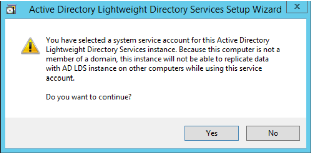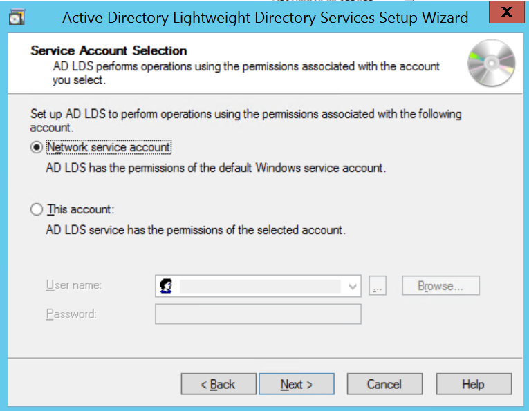 - Choose Network service account for running the AD LDS Service.