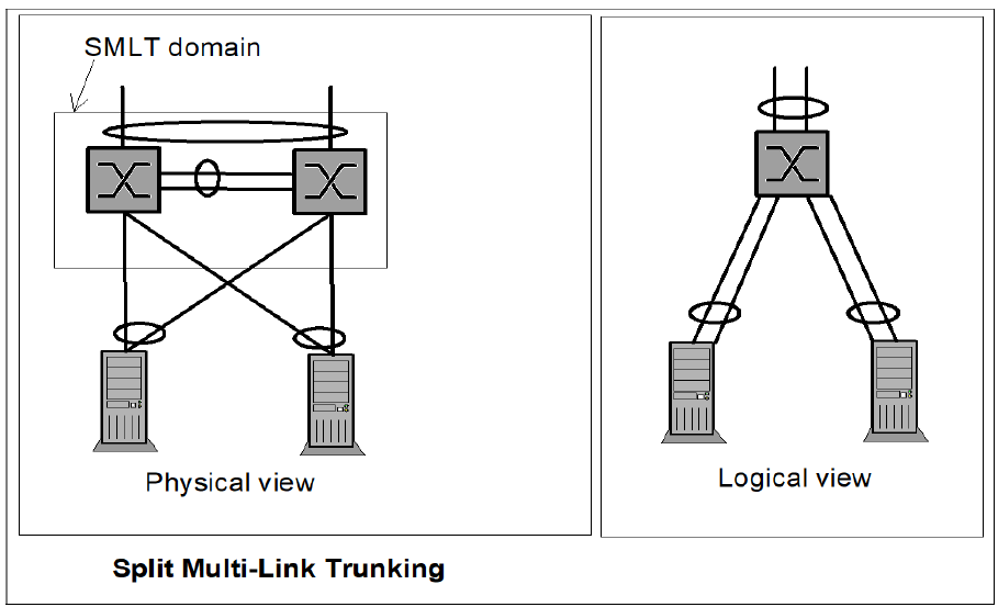 With Split Multi-Link Trunking two physical switches will look like one switch to the user. SMLT is a link aggregation technology. With SMLT load balancing and link redundancy could be achieved. A requirement is that the user should support IEEE 802.1ax (former 802.3ad).