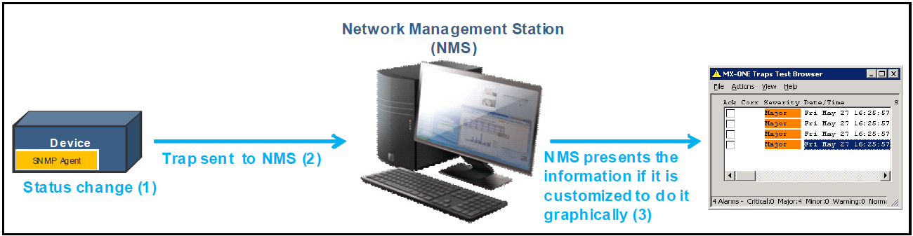 The agent sends Traps when a status change occurs in the monitored device. The Trap is received by Network Management Station (NMS) that can present the information in a graphical format, if properly configured, as shown in the figure below.