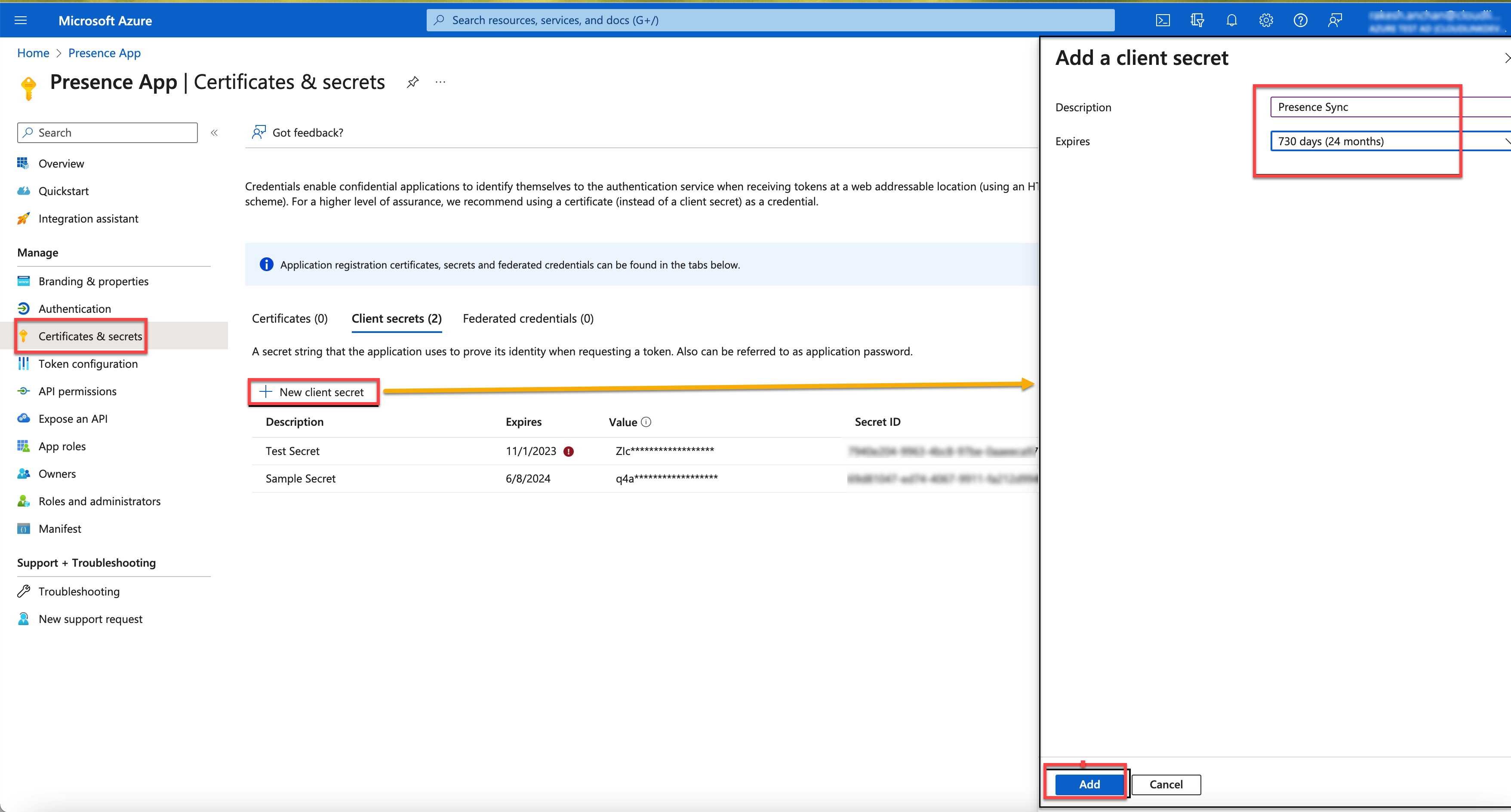 Geben Sie die Beschreibung ein und wählen Sie die Ablaufdauer aus. Sie haben die Möglichkeit, die Ablaufdauer von einem bestimmten Datum bis zu einem anderen bestimmten Datum (mit einer maximalen Ablaufdauer von zwei Jahren) auszuwählen. Klicken Sie auf Hinzufügen, um die Client-Geheimnisse zu erstellen.