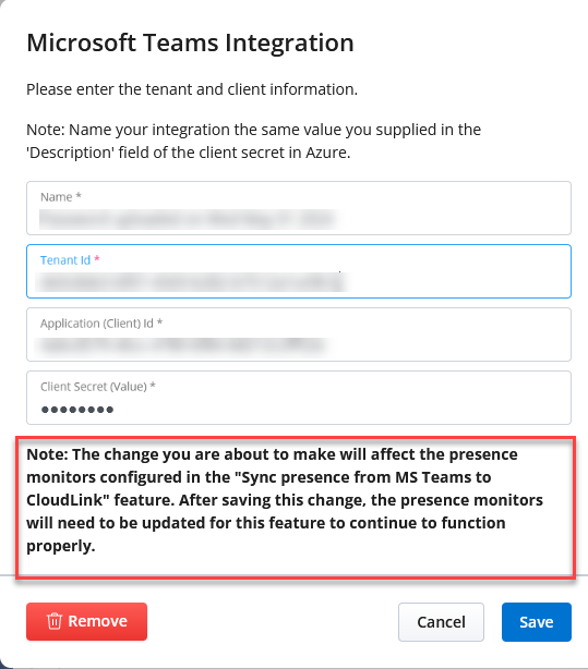 Bearbeiten Sie die Microsoft Teams-Integration und ändern Sie die Mandanten-ID und/oder die Client-ID. Wenn vorhandene Monitore vorhanden sind, wird der Administrator über diese Änderung informiert.