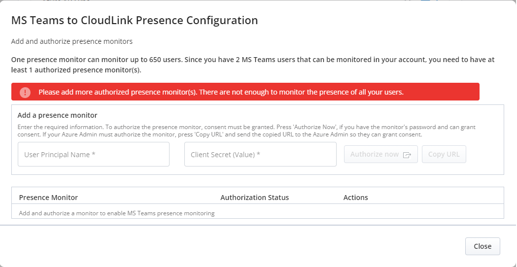 Es gibt zwei Weisen, jeden hinzugefügten Monitor zu autorisieren: Jetzt autorisieren und URL kopieren.Anmerkung: Die Schaltflächen Jetzt autorisieren und URL kopieren bleiben deaktiviert, bis sowohl der Benutzerprinzipalname als auch das Client-Geheimnis angegeben sind.