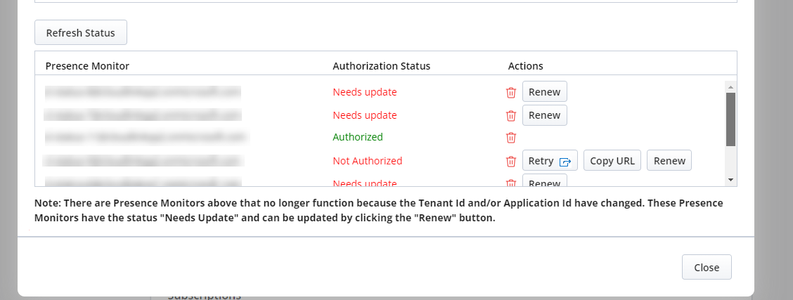 URL kopieren - ermöglicht es dem Microsoft Azure-Administrator, jeden Präsenzmonitor zu autorisieren. Wenn der Präsenzmonitor nicht autorisiert ist, hat der Administrator mehrere Optionen: Der Mitel Administrator klickt auf die Schaltfläche URL kopieren. Die kopierte URL wird zur Autorisierung an den Azure-Administrator gesendet.