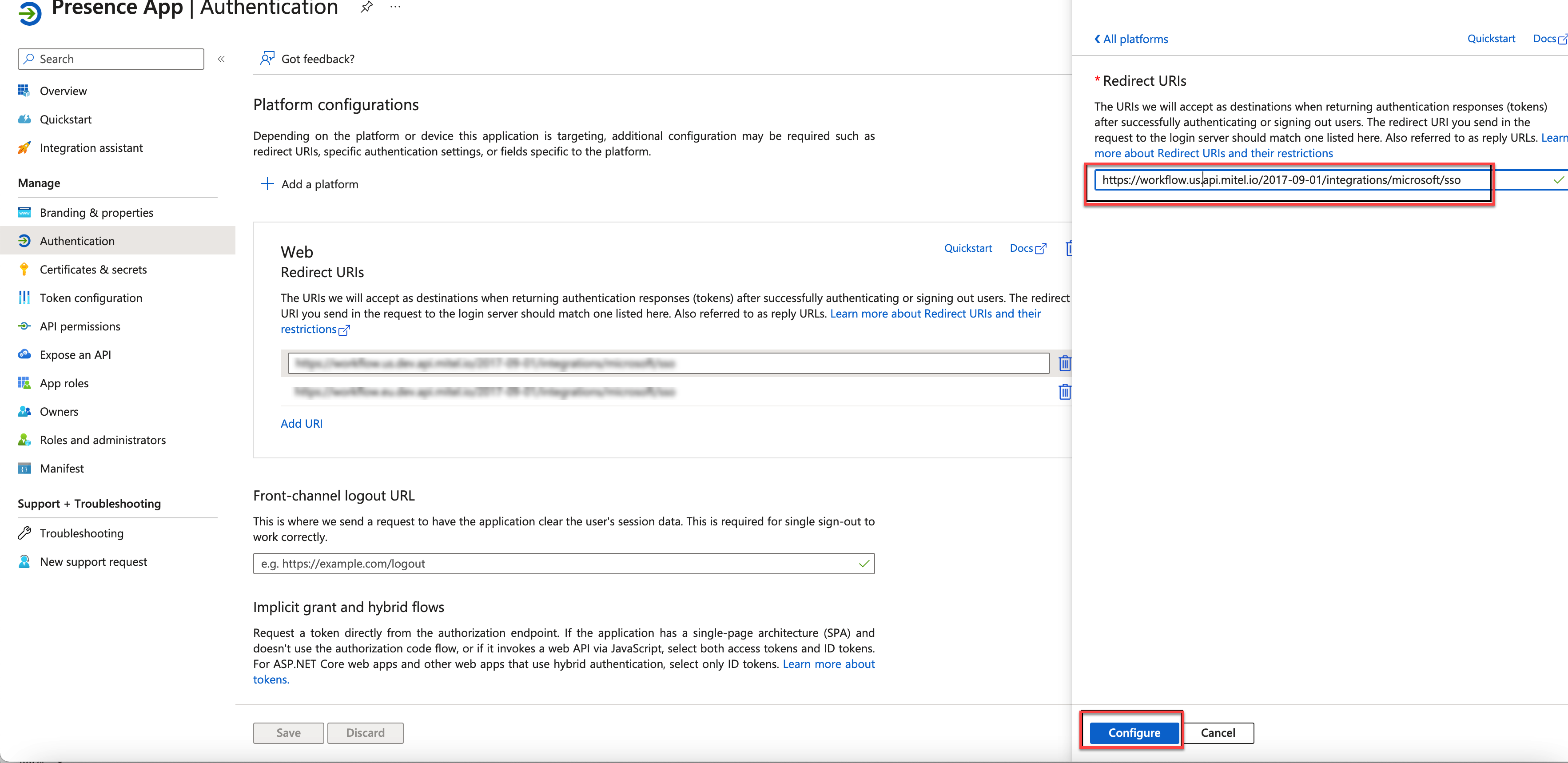 Geben Sie die Umleitungs-URI als https://workflow.<us/eu/ap>.api.mitel.io/2017-09-01/integrations/microsoft/sso ein. Die URI sollte auf eine Workflow-URL verweisen.