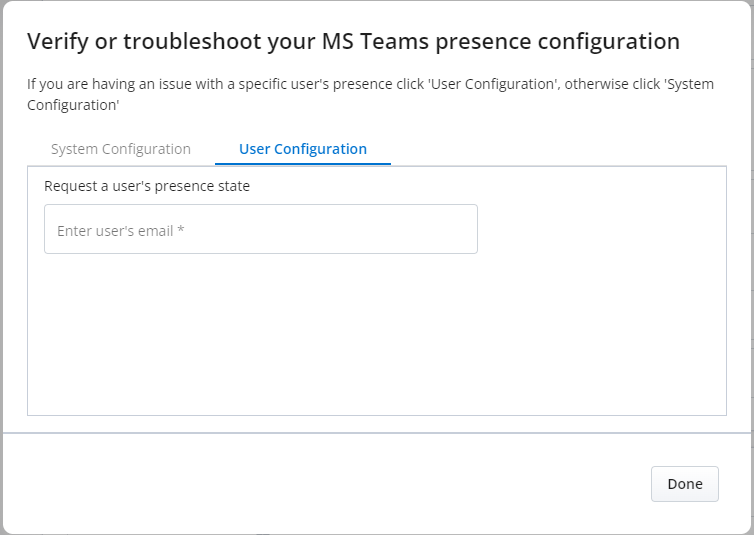Fordern Sie den Präsenzstatus eines Benutzers an, indem Sie die E-Mail-Adresse des Benutzers eingeben. Sobald die E-Mail bereitgestellt wurde, erscheint die Schaltfläche Präsenz abrufen.