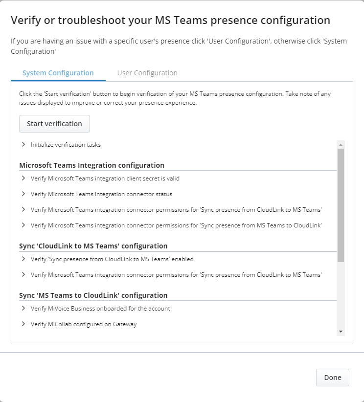 Das Fenster "Überprüfen oder Beheben von Problemen mit Ihrer MS Teams-Präsenzkonfiguration" wird angezeigt.