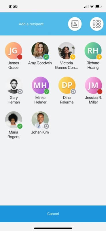 ) on the app call screen. - The active call is placed on hold and the Add a recipient screen opens where you can select and call the contact to whom you want to transfer the call by doing one of the following. When you call the contact to whom you want to transfer the call, the contact at the other end of the ongoing call is placed on hold.