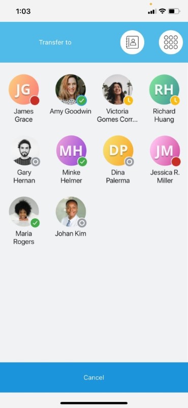 ) on the call screen.Select the Contacts option and search for the contact you want to transfer the call.
