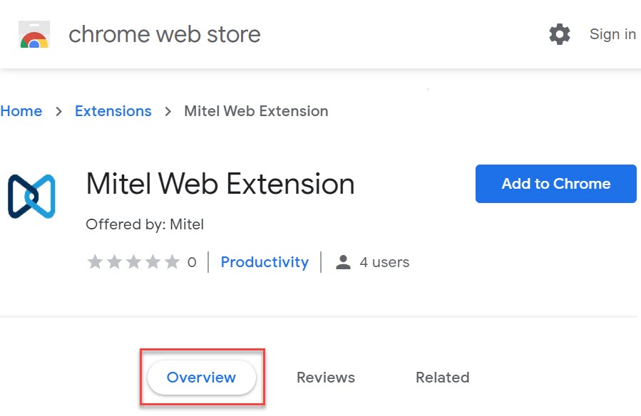 Navigate to the Mitel Web Extension Overview page in the Chrome Web Store.