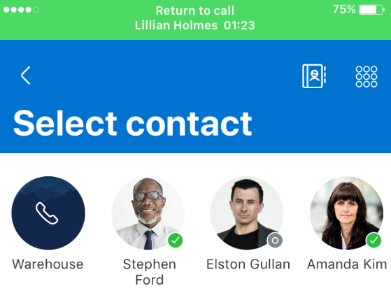 - La llamada activa se pone en espera y se abre la pantalla Agregar llamada, donde puede seleccionar el contacto al que desea llamar mediante una de las siguientes acciones:
