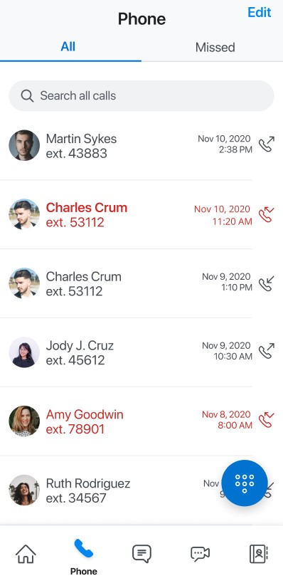 Le journal d'appels est synchronisé avec les contacts du répertoire consolidé configurés via le PBX (OIP/AD/répertoire public et privé). Si l'application est synchronisée avec le compte Office 365 d'un utilisateur, l'écran de l'historique des appels affichera le nom de l'utilisateur et les détails des contacts s'ils existent.