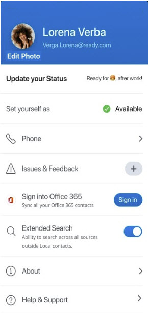 Le panneau de paramètres vous permet de modifier votre avatar et votre numéro de mobile ; de définir votre présence et un message d'état personnalisé ; d'activer ou de désactiver l'utilisation du réseau de l'opérateur dans le mobile pour gérer les appels ; de signaler un problème et de partager des commentaires sur l'application ; d'accéder à la documentation de l'aide en ligne, aux informations sur la version, à la politique de confidentialité et au contrat de licence de l'utilisateur final ; et d'afficher le numéro de version de l'application.