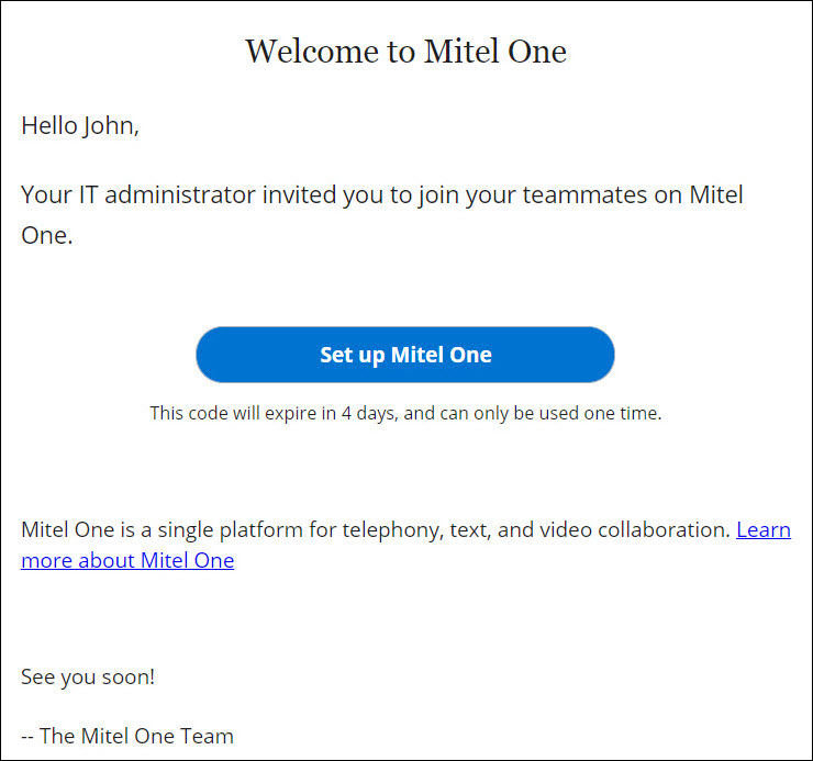2. L'e-mail de bienvenue comprend un bouton Configurer Mitel One.