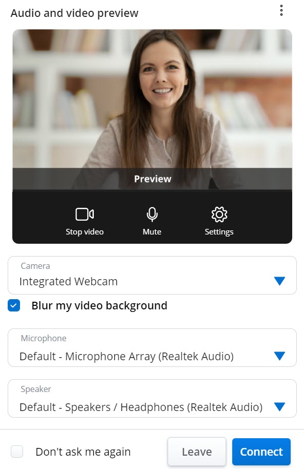 ) dans le panneau de Prévisualisation audio et vidéo qui s'affiche avant que vous ne rejoigniez une réunion. - Cochez la case Flouter mon arrière-plan vidéo.